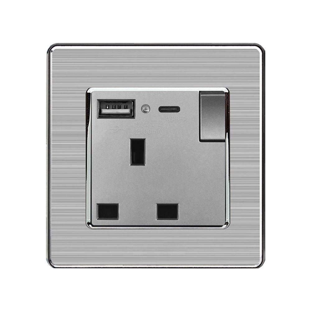 Silver switched socket with 2 x USB charging ports (1x Type A; 1x Type C). Features angled, in-line terminals and includes backed-out captive screws for easy installation. Ideal for charging iPads, iPhones, tablets, mobiles, cameras and more.