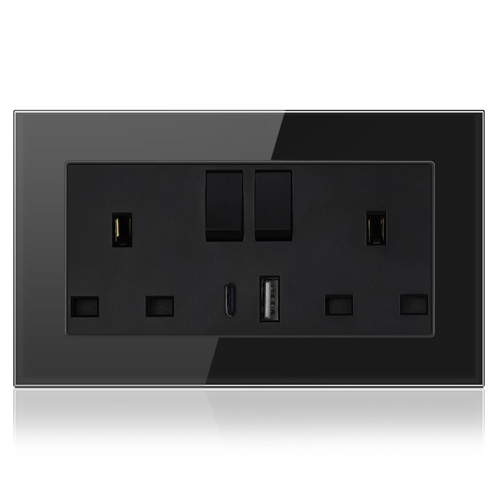 Tempered Glass Black switched socket with 2 USB charging ports. Features angled, in-line terminals and includes backed-out captive screws for easy installation. Ideal for charging iPads, iPhones, tablets, mobiles, cameras, MP3 players and many more devices.