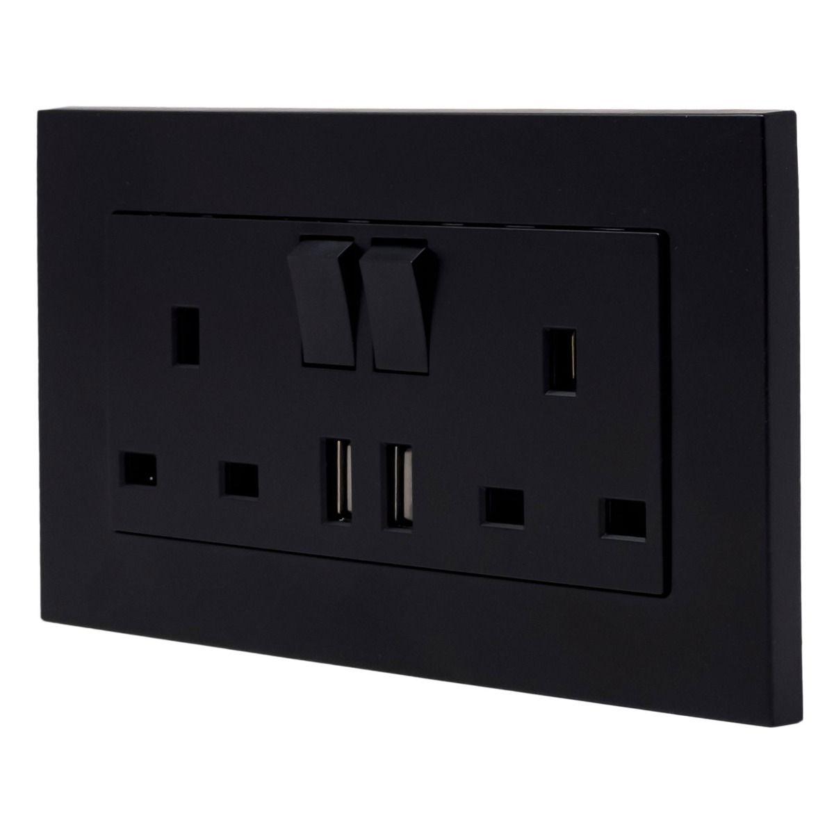 Black switched socket with 2 USB charging ports. Features angled, in-line terminals and includes backed-out captive screws for easy installation. Ideal for charging iPads, iPhones, tablets, mobiles, cameras, MP3 players and many more devices.