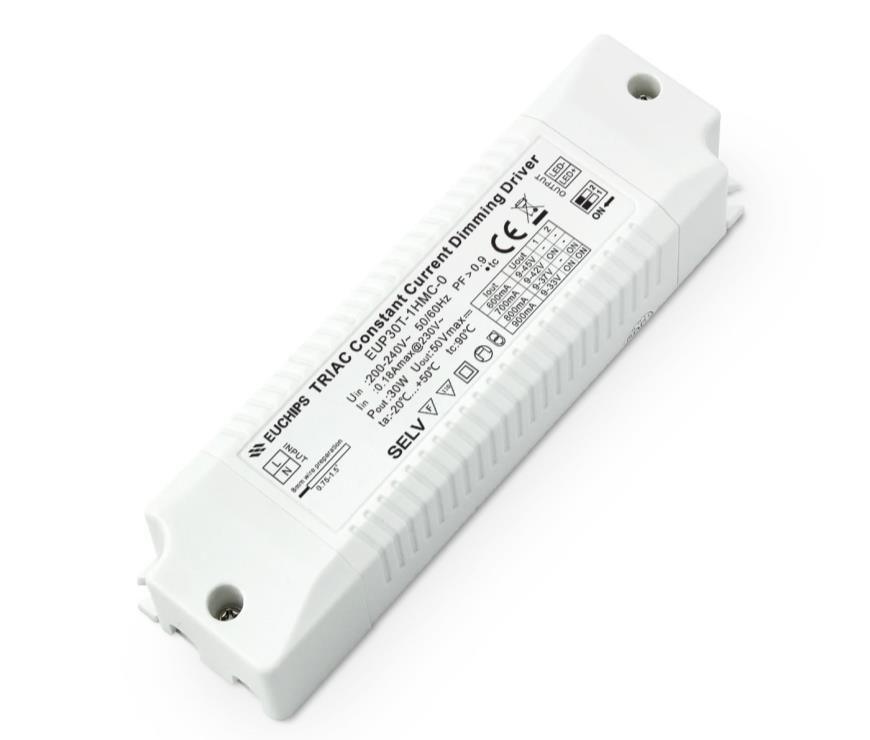 EUP30T-1HMC-0 is a constant current mode output LED driver. The output current can be easily set via the DIP dial switch. The driver supports leading edge (Triac) and trailing edge (ELV) dimmers and can be compatible with the systems of various brands (Philips, Panasonic, Lutron, Simon, ABB, Siemens, Dalitek etc.) to achieve a smooth dimming effect.