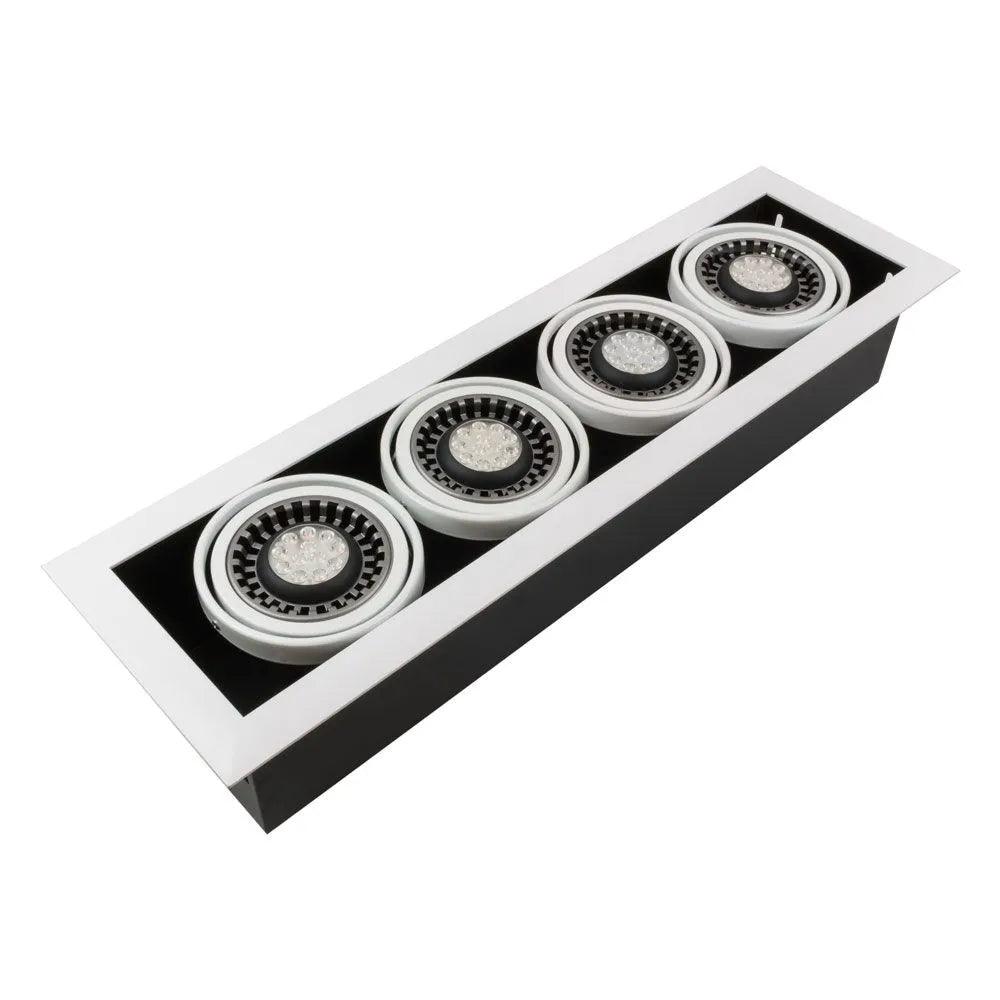 AR111 Vega adjustable gimbal for Four LED G53 & GU10 Spots. The AR111 Rectangular Gimbal kit is made with a dual ring "gimbal" system for rotating horizontally and vertically up to 180 degrees. The VEGA trim is made of aluminium and steel housing. It has a very sturdy and flexible structure that makes it the number one solution for accent lighting in shops, restaurants and showrooms.
