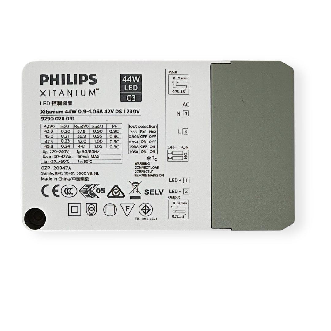 Controlled current from 900mA to 1050mA, 42Vdc with AC input 220-240VAC. Universal constant current power supply made by Philips.